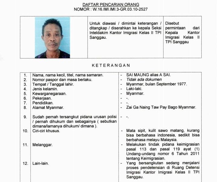 FAKTA GRUP – Seorang Warga Negara Asing (WNA) asal Myanmar ditetapkan dalam daftar pencarian orang (DPO) usai kabur dari pemeriksaan di ruang Detensi Kantor Imigrasi Kelas II TPI Sanggau, Senin 2 September 2024 dini hari . Informasi tersebut diperoleh wartawan dari group whatApps.